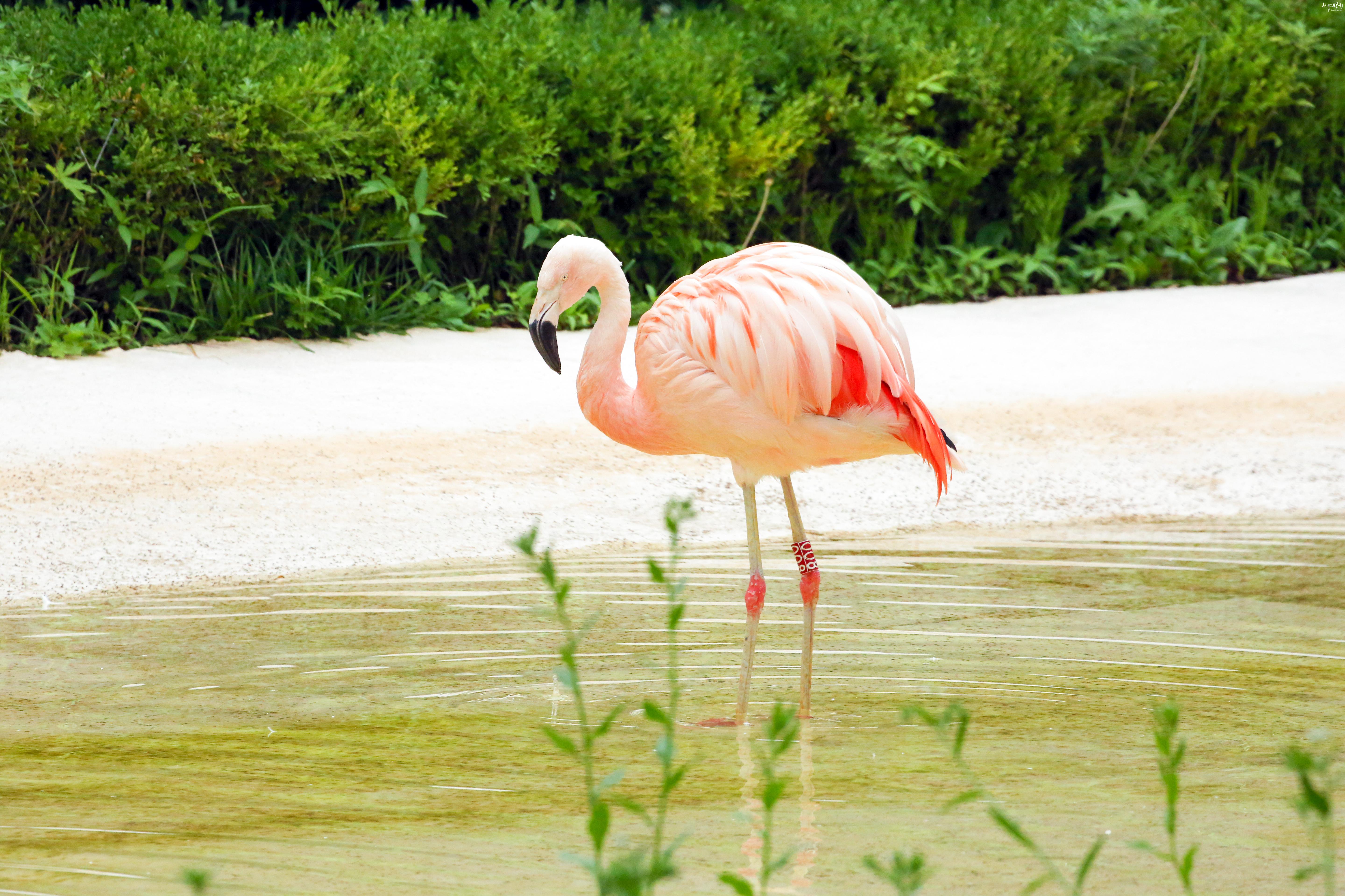 큐바홍학보다 몸이 작고 색깔도 덜 진한 분홍색을 띤다. 항상 많은 수의 무리를 이루고 있으며 번식지에는 개흙을 쌓아올려 탑모양의 알자리를 만든다. 굽은 부리 속 빗살 모양의 미세한 필라멘트 조직이 촘촘하게 배열되어있어 그 사이로 물만 버리고 걸러 먹는다.