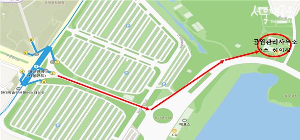 ※ 4호선 대공원역 2번 출구로 300m 직진 후 분수대에서 왼쪽방향으로 약400m 이동 약 15분 소요됨.