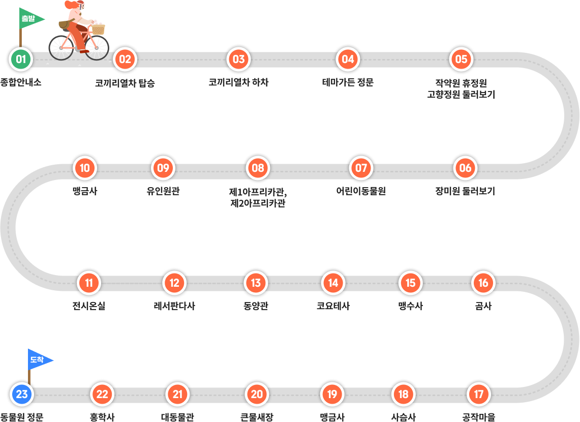 종합안내소 - 코끼리열차 탑승 - 동물원 정문 - 테마가든 입장 - 작약원 휴정원 고향정원 둘러보기 - 장미원 둘러보기 - 어린이동물원 - 제1아프리카관, 제2아프리카관 - 유인원관 - 제3아프리카관 - 식물원 - 렛서팬더관 - 동양관 - 코요테사 - 맹수사 - 곰사 - 공작마을 - 사슴사 - 맹금사 - 큰물새장 - 대동물관 - 홍학사 - 코끼리 열차 탑승